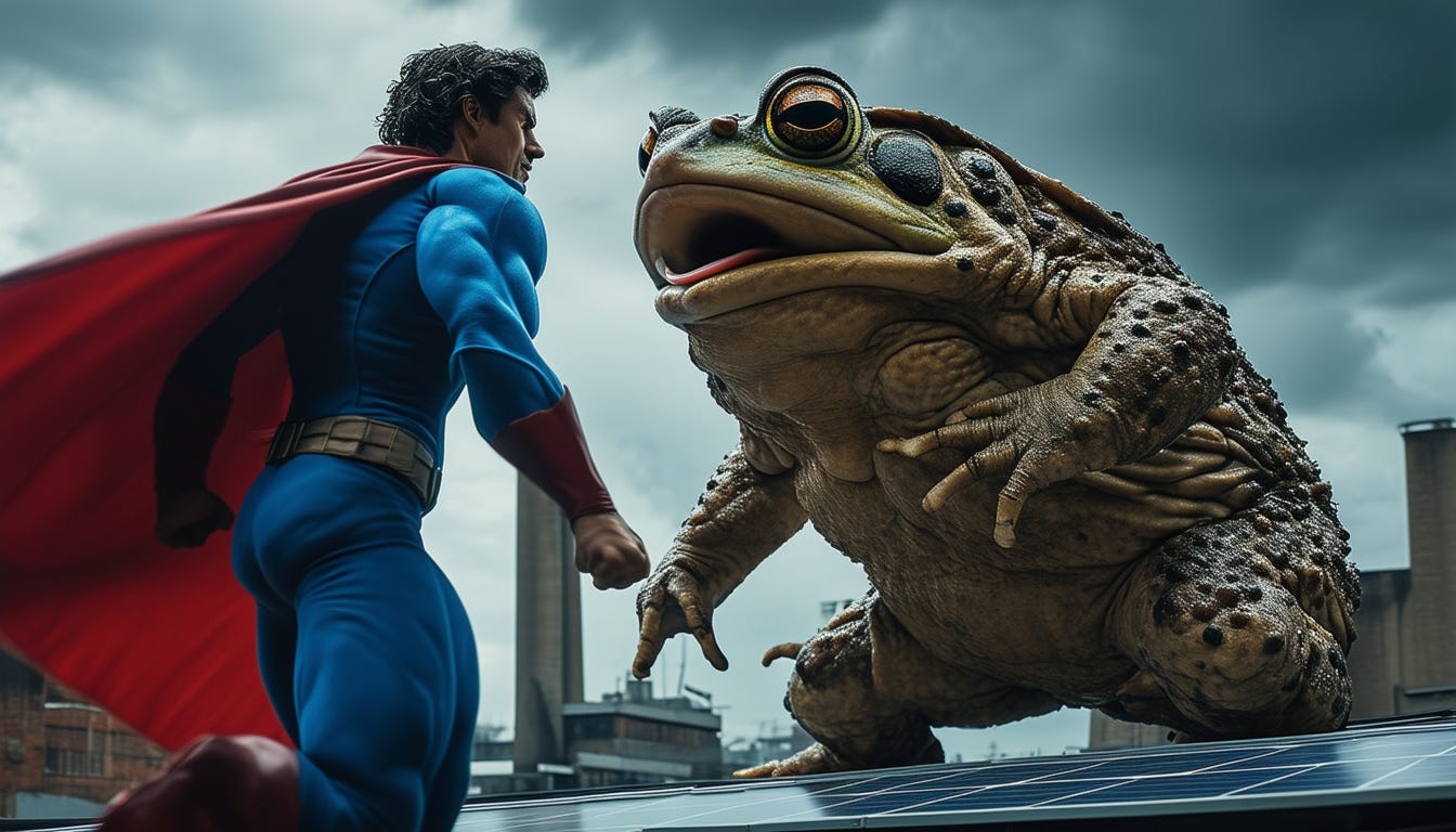 V teh mlakah so tudi žabe, ki so pridno jedle te komarje, ki so bili polni Supermanove krvi. Vsaj ena od teh žab je mutirala v ogromno, 100 ton težko, super žabo! No, za eno vemo, ker je prilezla iz gozda in …”