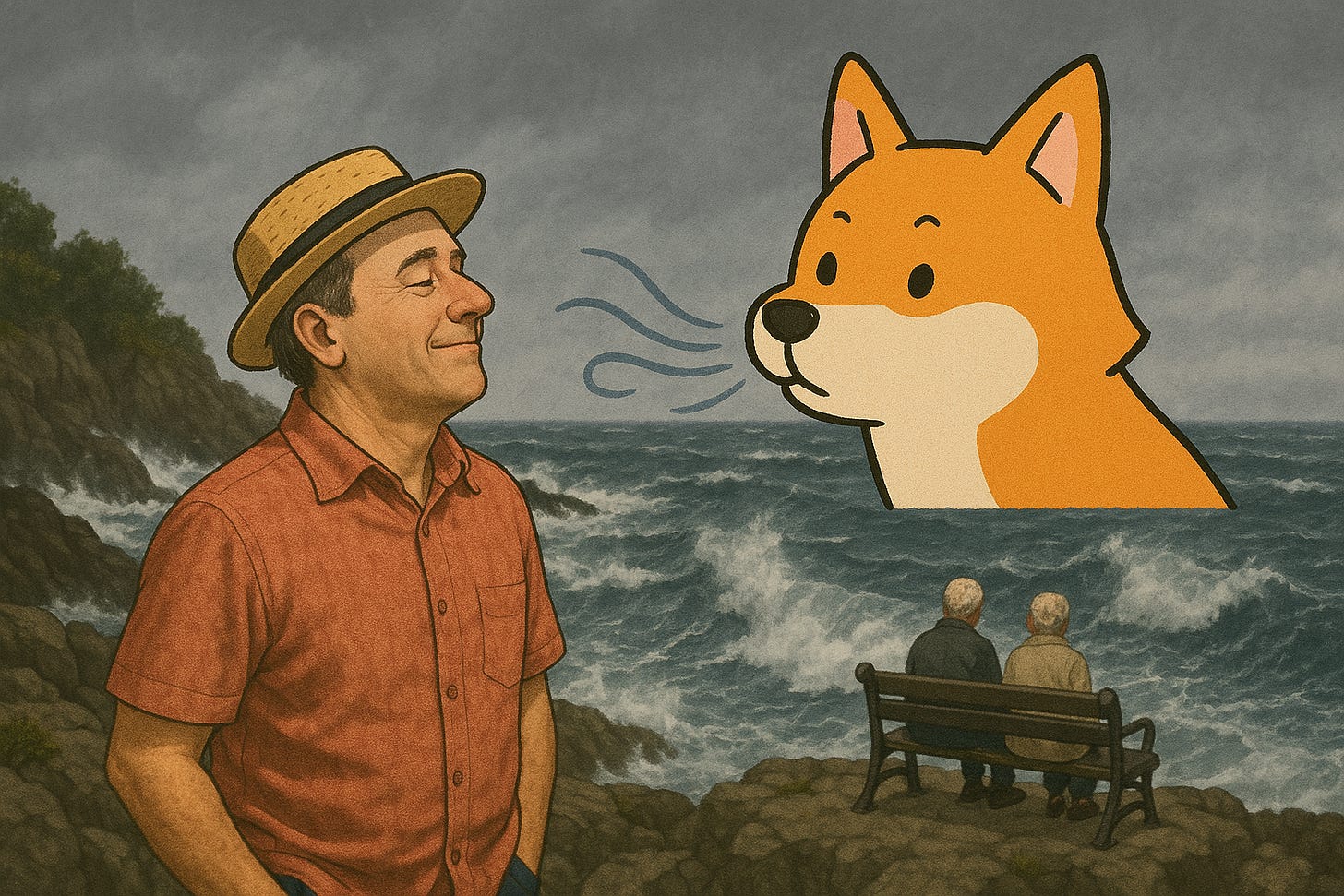 Nasmehnil se je in si v mislih naslikal velikega psa, ki z morja piha in mu osvežitev podarja.Lani smo v službi imeli tečaj vizualizacije z meditacijo (vem, vem, fajn služba). Od takrat se med meditacijo (skoraj) vsako jutro postavim na skalnato platformo ob obali med Koprom in Izolo. Zgradili so jo, ko so zaprli cesto za promet. Sedim s prekrižanimi nogami, pogled obrnjen proti Benetkam. Včasih je oblačno, včasih jasno in ravno sonce vzhaja, včasih pa močno piha. Kadar so moje misli razburkane, piha še posebej močan maestral in mi prinaša slano vodo na obraz. Včasih voda prijetno osveži in osvobaja misli, drugič pa morska sol zariše rane na licih. To je le del te meditacije.