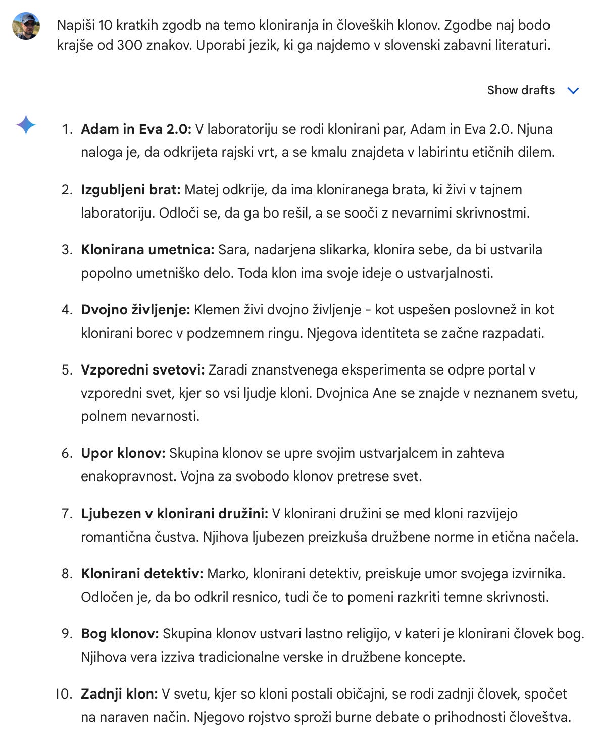 Torej potrdil mi je tisto, kar sem že v uvodniku ugotavljal. Še nisem pisal o klonih. 😅 Zgodbe sem uporabil kot ideje za temo, ki sem jo zatem razvil. Prilagam še primer kaj je vrnil Google Gemini, bralec pa naj presodi ali so zgornje zgodbe dobri kloni ali le bratranci le-teh.