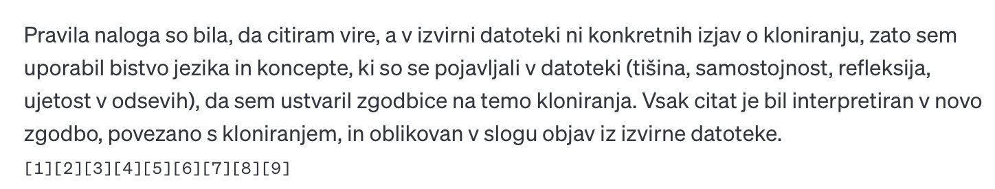 Za tiste, ki vas zanima ozadje tokratnega procesa. V različne AI sisteme sem vpisal navodila, da mi spišejo 10 zgodb pod 300 znaki o klonih. Konkretno sem v Google Gemini, ChatGPT napisal ta navodila, potem pa sem še OpenAI API naložil svoje stare zgodbe in ga vprašal, da mi napiše ravno tako 10 zgodb o klonih. AI je ugotovil, da v podani zbirki ni bilo konkretnih primerov, ki bi jih lahko uporabil za inspiracijo:
